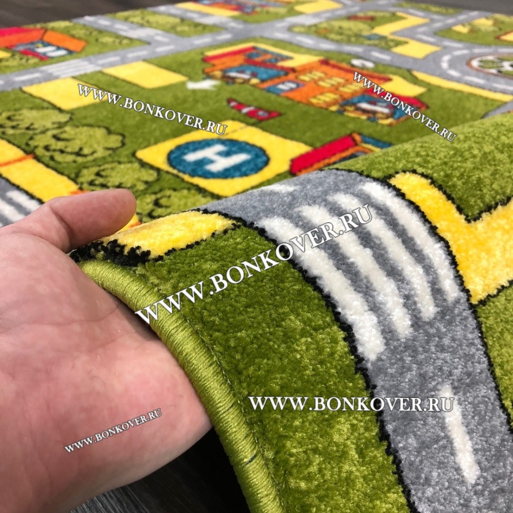 Детский Ковер Город 02 Зеленый не деформируется, сохраняет свою форму. Ворс легко восстанавливается, что не оставляет на поверхности изделия неприглядных отметин.